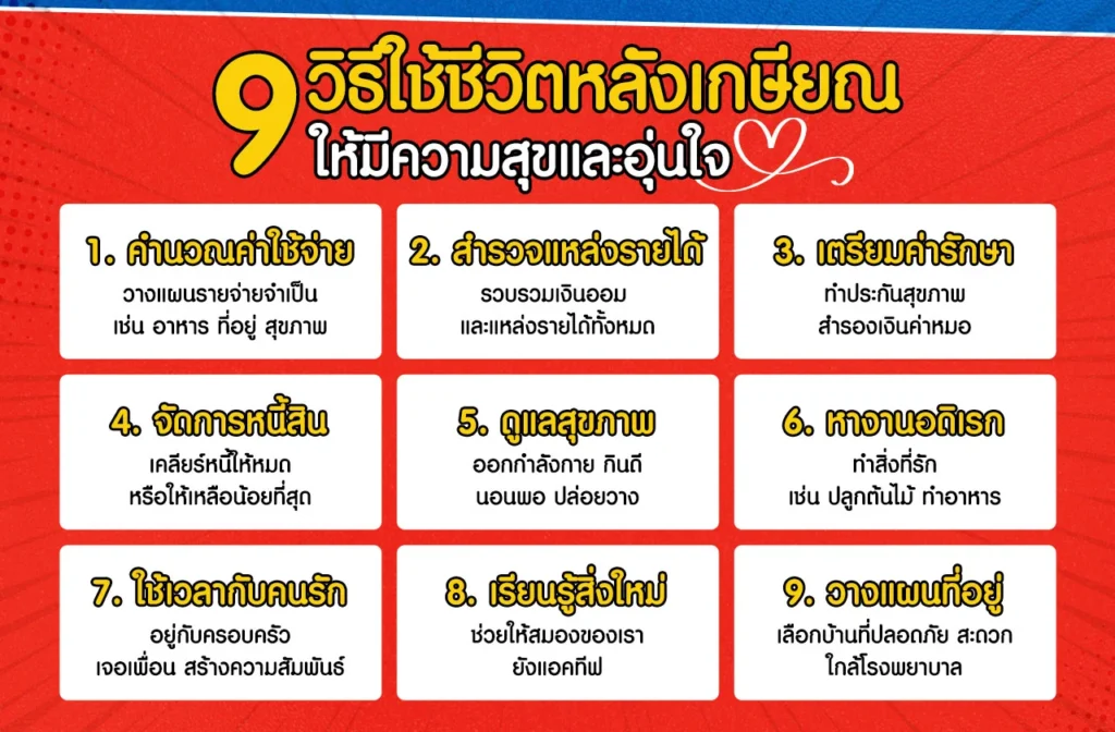 การเกษียณไม่ใช่จุดสิ้นสุดของการใช้ชีวิต แต่คือการที่พี่จะใช้ชีวิตในช่วงวัยนี้ให้มีความสุขและอุ่นใจได้อย่างแท้จริงนั้น ทั้งนี้ก็จำเป็นต้องมีการวางแผนที่ดีรอบด้าน ไม่ใช่แค่เรื่องเงินทองที่ต้องมั่นคงเท่านั้น แต่ยังรวมไปถึงการดูแลสุขภาพกายใจ การมีกิจกรรมที่รักทำและการมีสังคมที่อบอุ่นด้วย