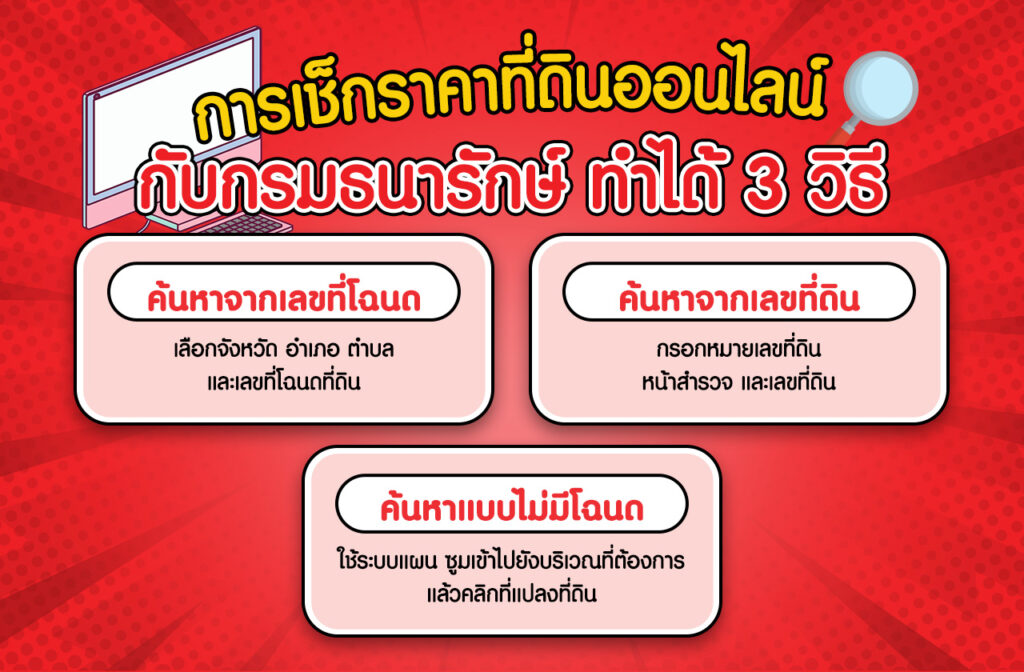 ปัจจุบันการเช็กราคาที่ดินทำได้ง่าย ๆ ผ่านมือถือ เพียงเว็บไซต์ระบบเผยแพร่ราคาประเมินของกรมธนารักษ์ โดยสามารถค้นหาได้ 3 วิธี ได้แก่ การค้นหาจากเลขที่โฉนด เลขที่ดิน หรือแม้แต่กรณีที่ไม่มีโฉนด ก็สามารถค้นหาได้จากแผนที่ครับ