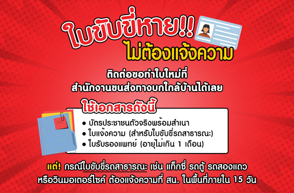 กรณีใบขับขี่หายไม่ต้องเข้าอบรมใหม่ เพราะถือว่าเคยผ่านการอบรมและทดสอบมาแล้ว ต่างจากกรณีใบขับขี่หมดอายุที่ต้องเข้าอบรมทบทวนความรู้ใหม่ แต่พี่ ๆ ต้องเตรียมเอกสารให้ครบถ้วนเพื่อความรวดเร็วในการดำเนินการครับ