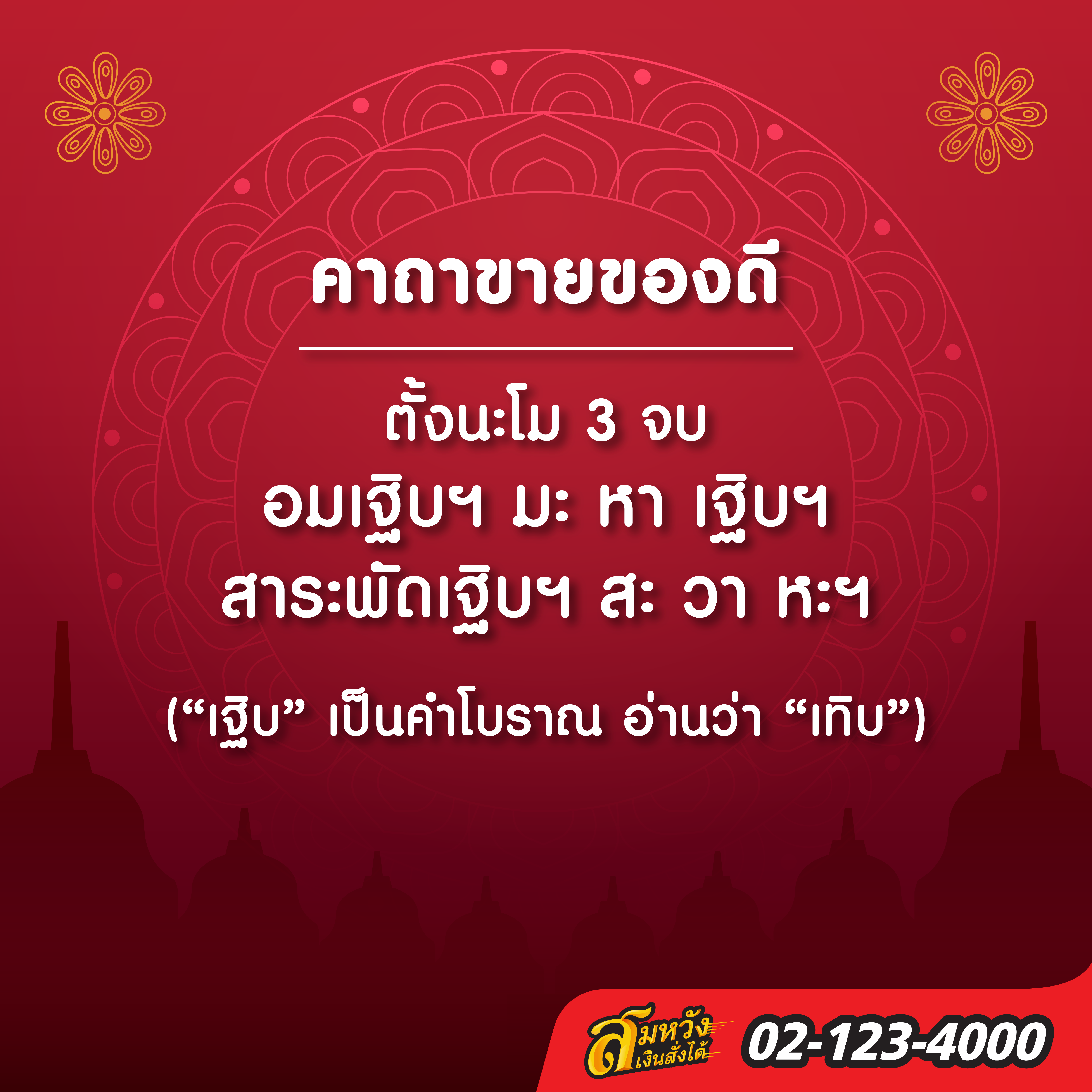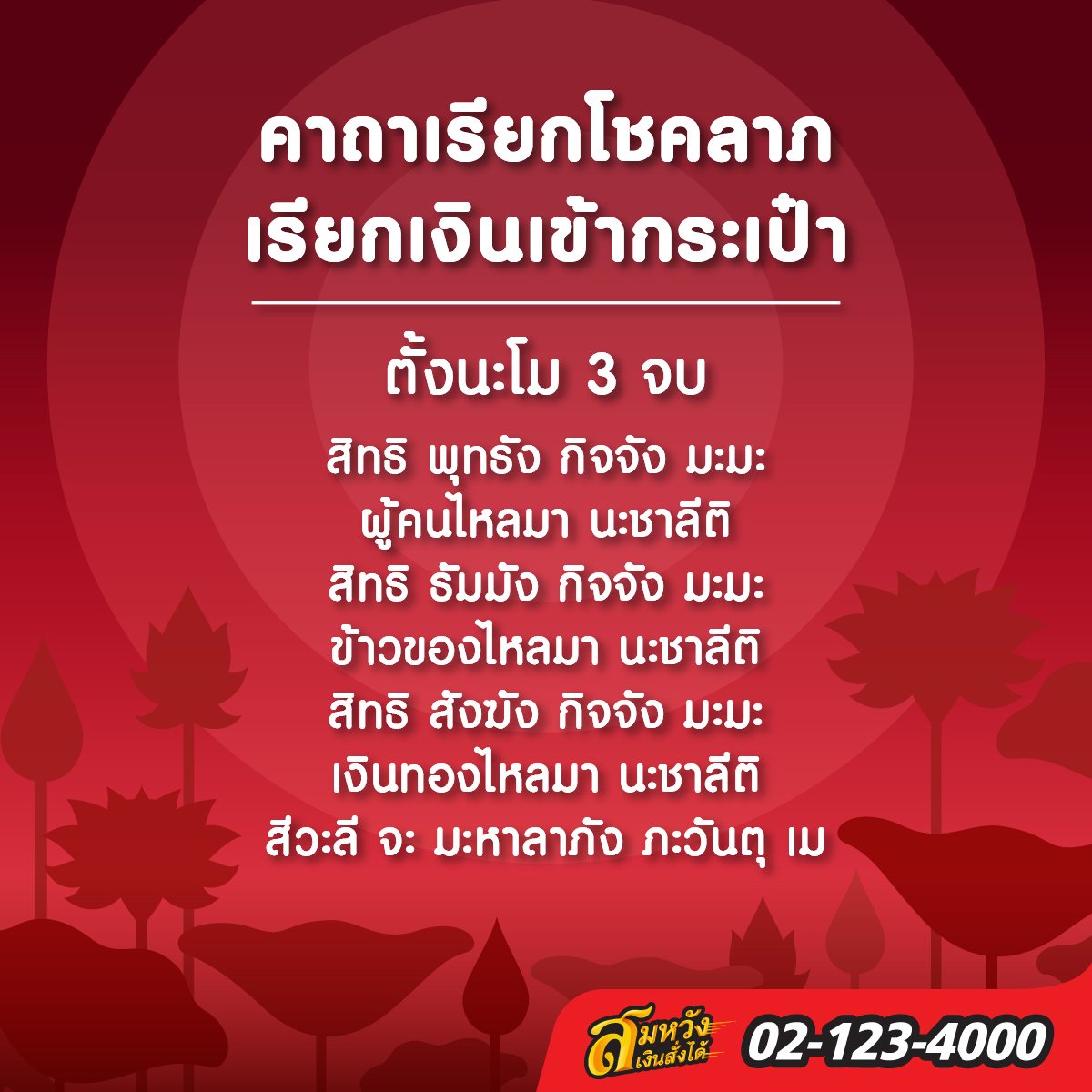 คาถาบทนี้ใช้สวดเพื่อเรียกเงินเข้ากระเป๋า สามารถสวด 3 จบ 5 จบ 7 จบ หรือจะสวด 9 จบก็ได้ครับ