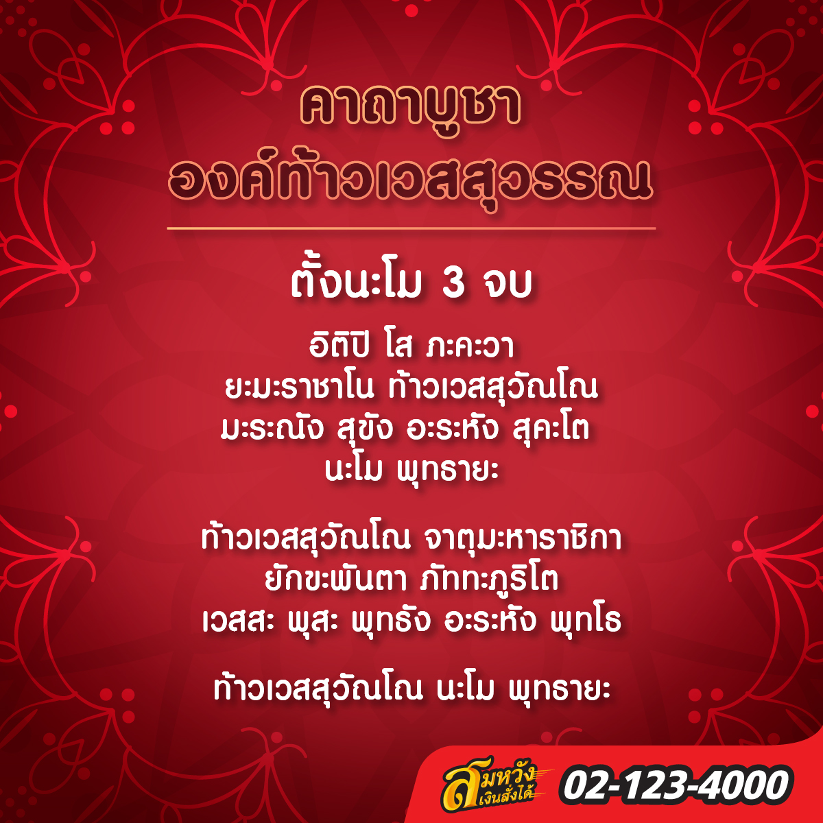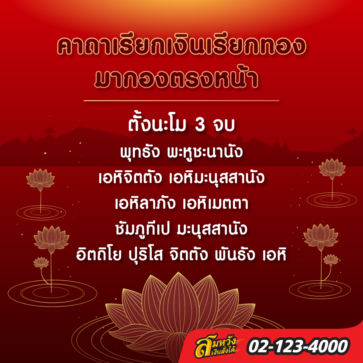 คาถานี้สามารถสวดได้ทุกวัน วันละ 3 จบ 9 จบ หลังตื่นเช้าและก่อนนอน ทำให้เงินทองไม่ขาดมือ