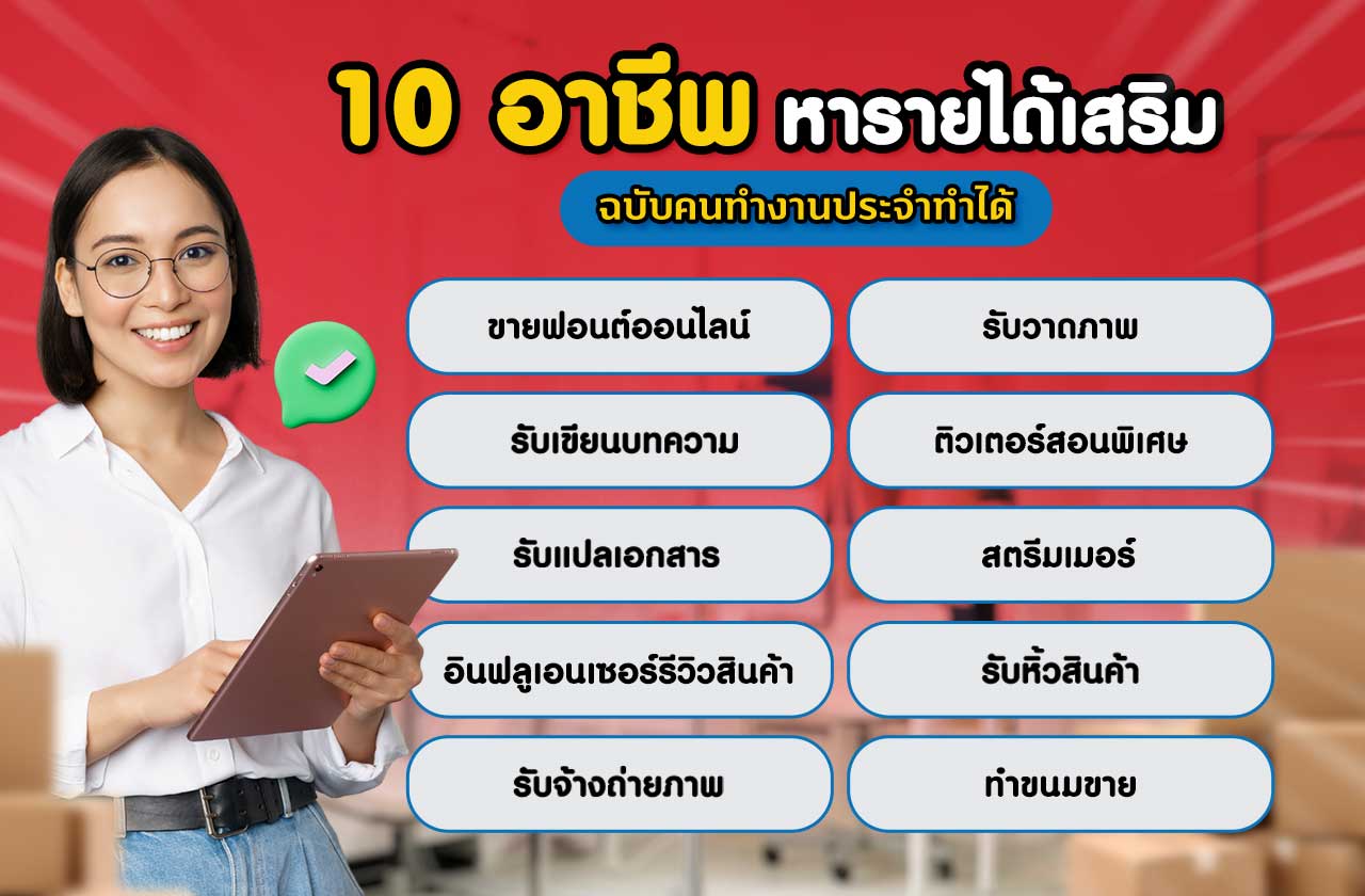 โดย 10 อาชีพหารายได้เสริมที่คนทำงานประจำก็ทำได้ คือ ขายของออนไลน์, รับเขียนบทความ, รับแปลเอกสาร, อินฟลูเอนเซอร์รีวิวสินค้า, รับจ้างถ่ายภาพ, ขายภาพถ่ายออนไลน์, ติวเตอร์สอนพิเศษ, สตรีมเมอร์, รับหิ้วสินค้า และขายสินค้า Handmade ซึ่งที่กล่าวมาเกือบจะเป็นอาชีพเสริมออนไลน์ที่ไม่ว่าใครก็ทำได้ แต่แนะนำให้เลือกอาชีพที่เราชอบจะทำให้เรามีความสุขที่จะทำนะครับ
