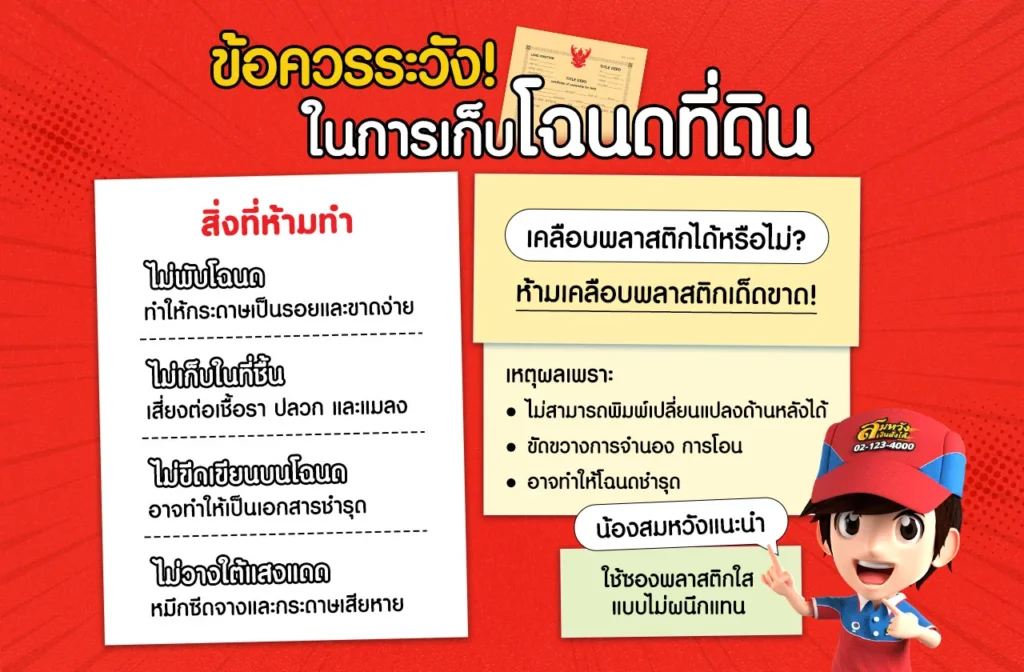 นอกเหนือจากวิธีเก็บโฉนดที่ดินที่ถูกต้องแล้ว ก็มีข้อห้ามที่พี่ ๆ ต้องระวังเด็ดขาด เพื่อไม่ให้โฉนดของเราเสียหายโดยไม่ได้ตั้งใจอีกด้วยนะครับ