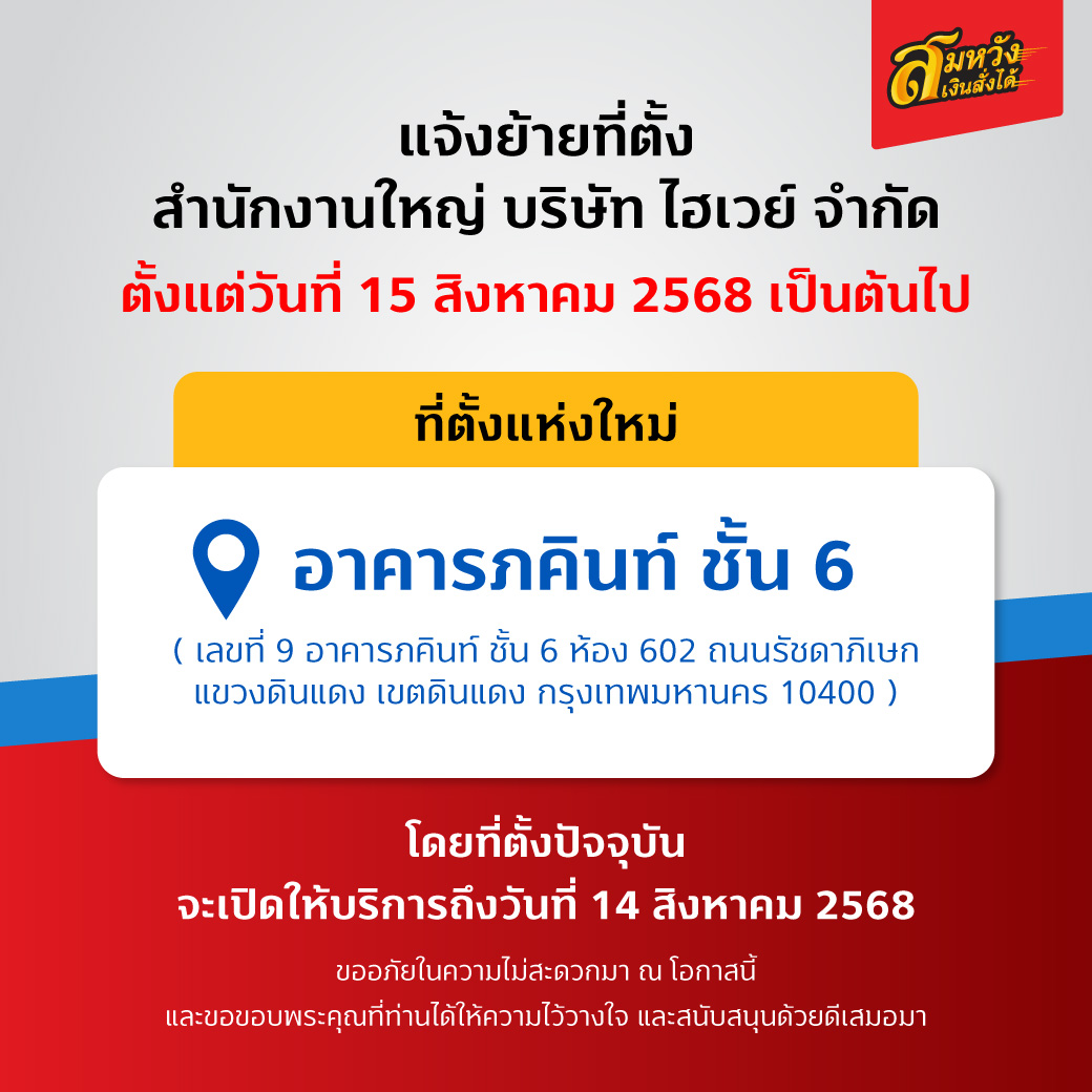 4 มี.ค. 2567 - สมหวัง เงินสั่งได้ แบรนด์ผู้ให้บริการสินเชื่อจำนำทะเบียนรถและนายหน้าประกันภัยของบริษัท ไฮเวย์ จำกัด ในกลุ