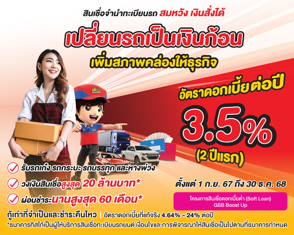 ระยะเวลาสมัครสินเชื่อสินเชื่อจำนำทะเบียนรถ เพื่อหมุนเวียนธุรกิจ SME ตั้งแต่ 1 กันยายน 2567 ถึง 30 ธันวาคม 2568