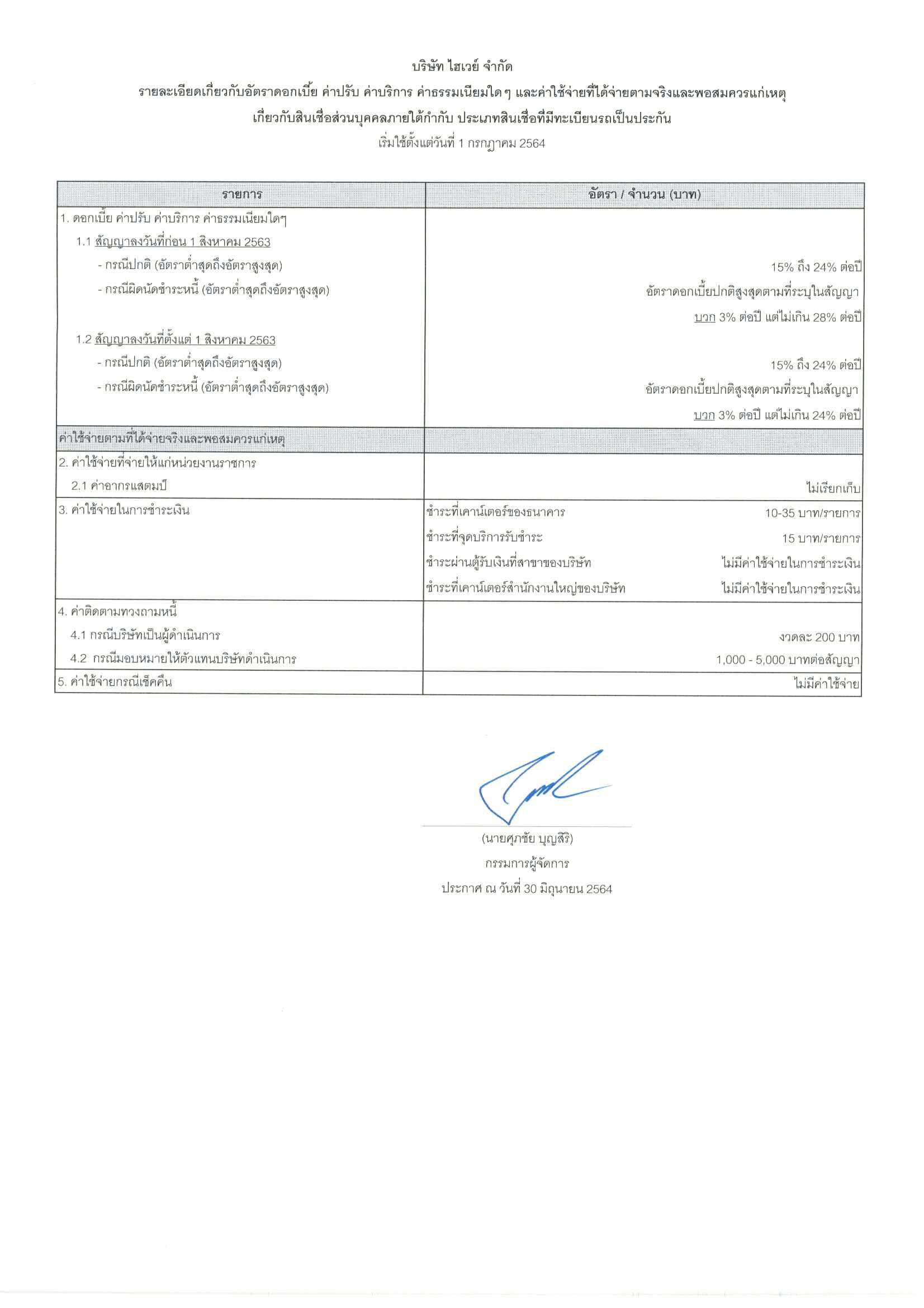 - อัตราดอกเบี้ย ค่าปรับ ค่าบริการ ค่าธรรมเนียมใดๆ และค่าใช้จ่ายที่ได้จ่ายตามจริงและพอสมควรแก่เหตุ เกี่ยวกับสินเชื่อส่วนบุคคลภายใต้กำกับ ประเภทสินเชื่อที่มีทะเบียนรถเป็นประกัน (อัปเดท 12 ก.ย. 2564)